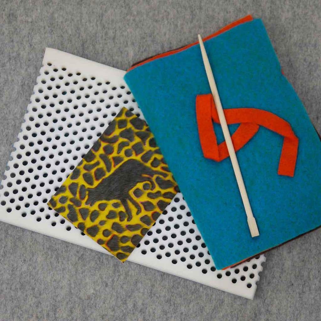 Upwolving Starterset which contains a Upwolving mat size 20 x 30 cm, 4 pieces of needled fleece, and a wooden pen.