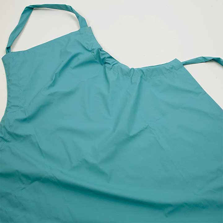 Dit blauwe schort heeft een waterdichte, matte rubberachtige coating en een verstelbare neklus. Ideaal voor natte werkzaamheden zoals vilten en verven.